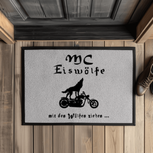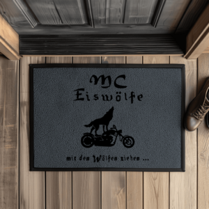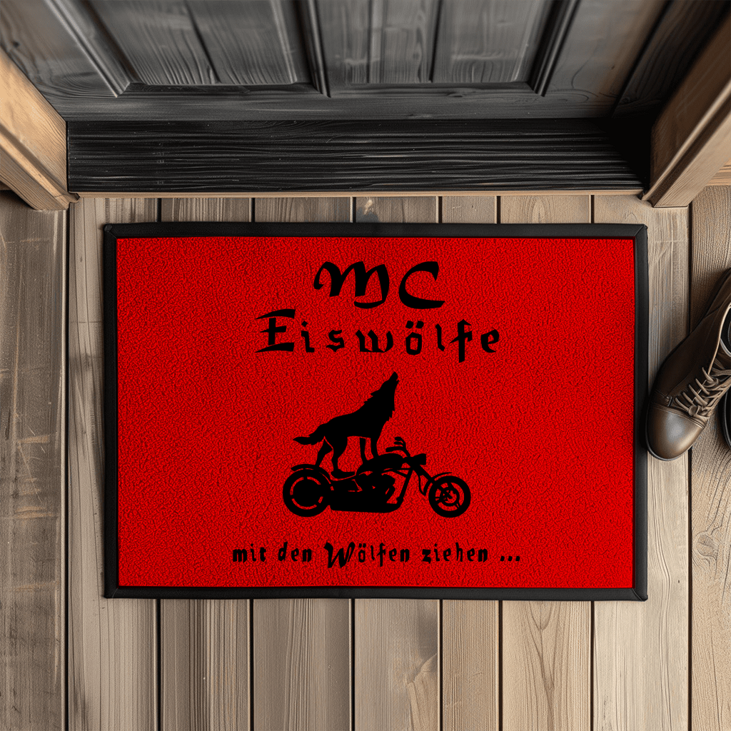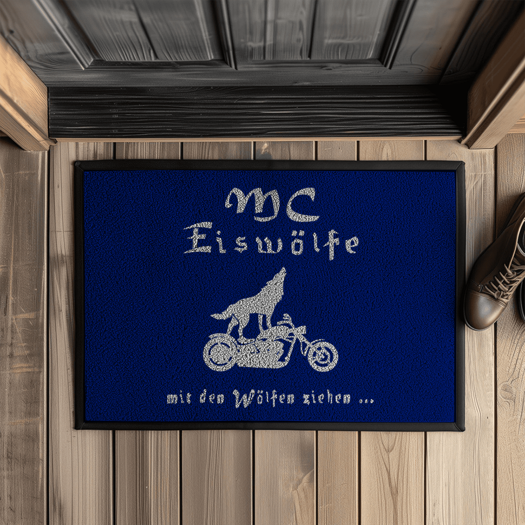 Markante Fußmatte mit MC Eiswölfe Merzig Motiv „Mit den Wölfen ziehen“ für echten Rudel- und Clubstolz.