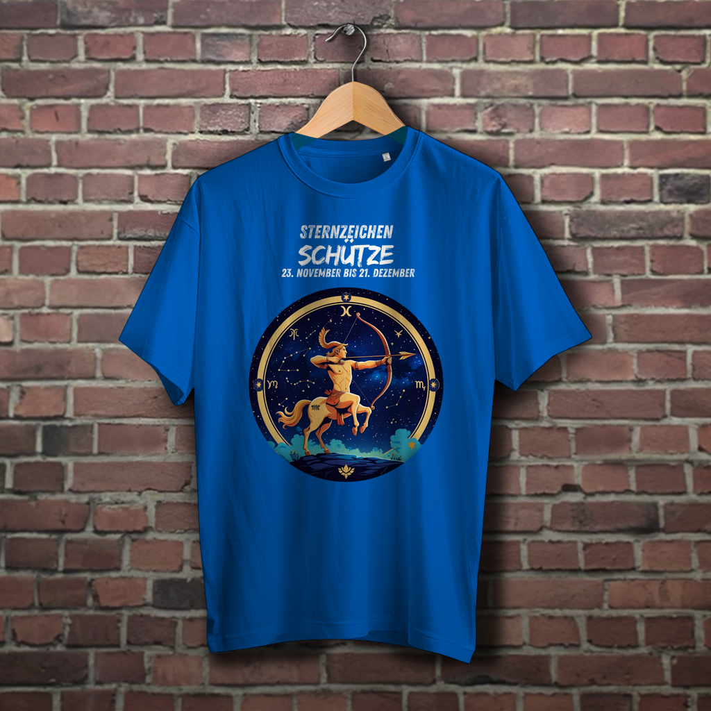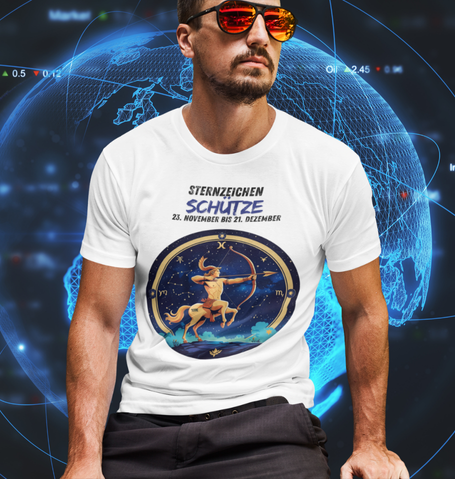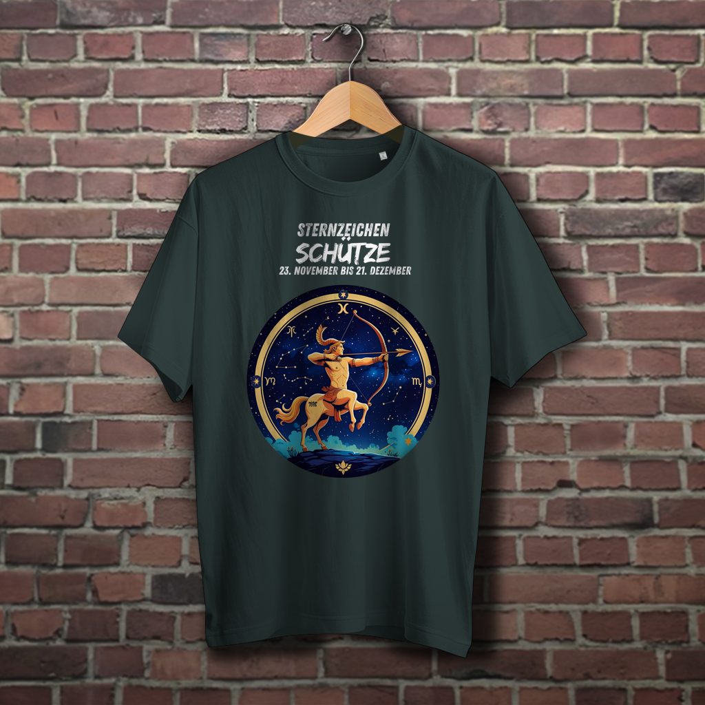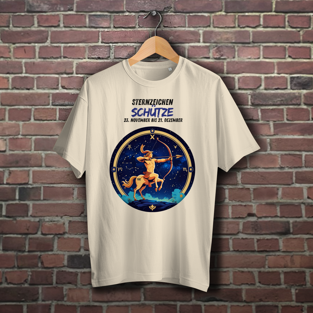 Hochwertiges T-Shirt mit markantem Schütze-Sternzeichen-Motiv – ideal für Abenteurer und Astrologie-Fans.