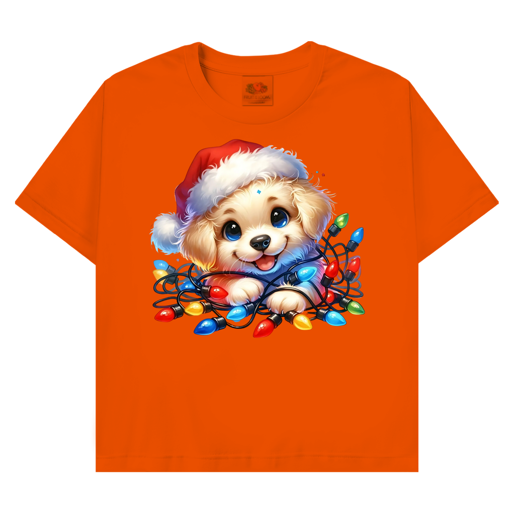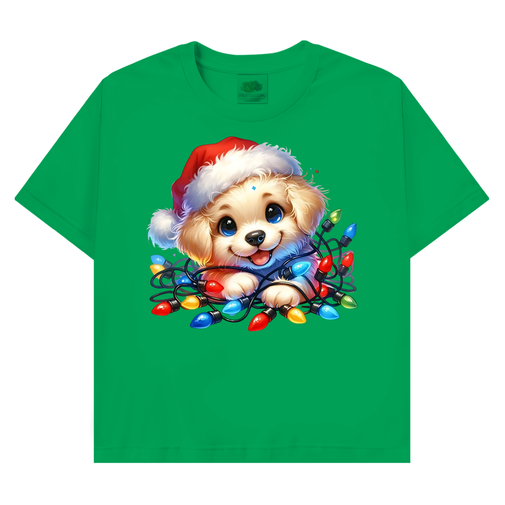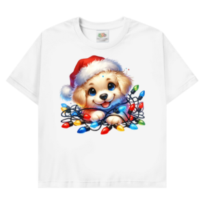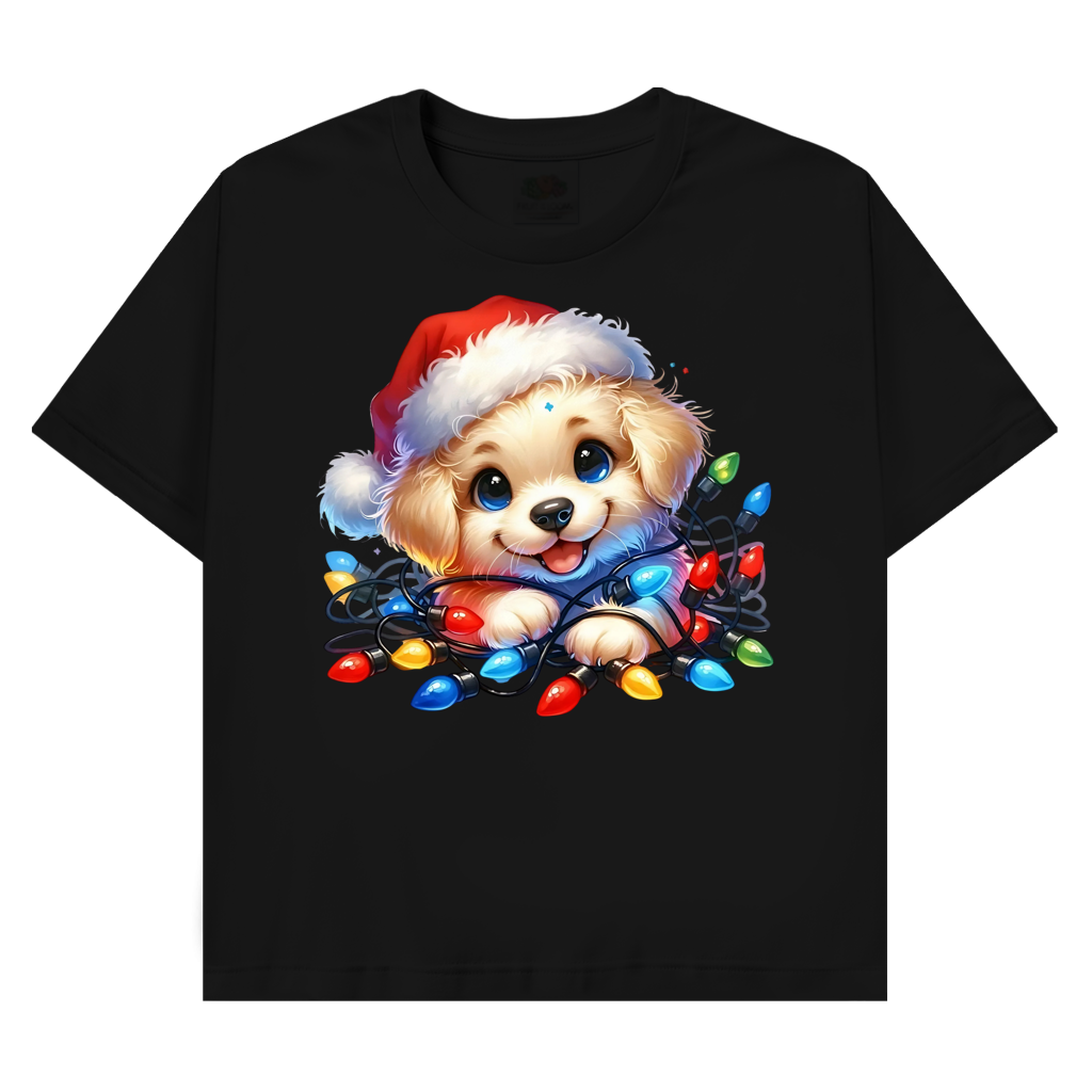 Weihnachtliches T-Shirt mit süßem Welpen und Lichterkette – ein funkelnder Blickfang für die Festtage.